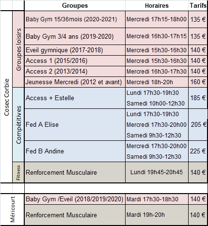 Les adhérent(e)s sont réparti(e)s en fonction de leur âge, de leurs capacités et de leur motivation dans les groupes : Petite Enfance, Eveil Gymnique, Gym Loisirs ou dans les différents groupes compétitifs.